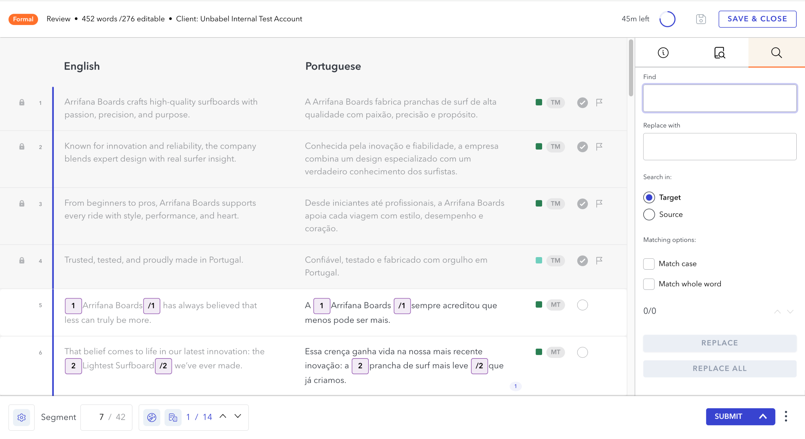 The Find and Replace tab allows you to quickly search for specific words or phrases within the source or target text of the current task. This feature is especially useful for ensuring consistency across segments, correcting repeated errors, or applying terminology changes efficiently.