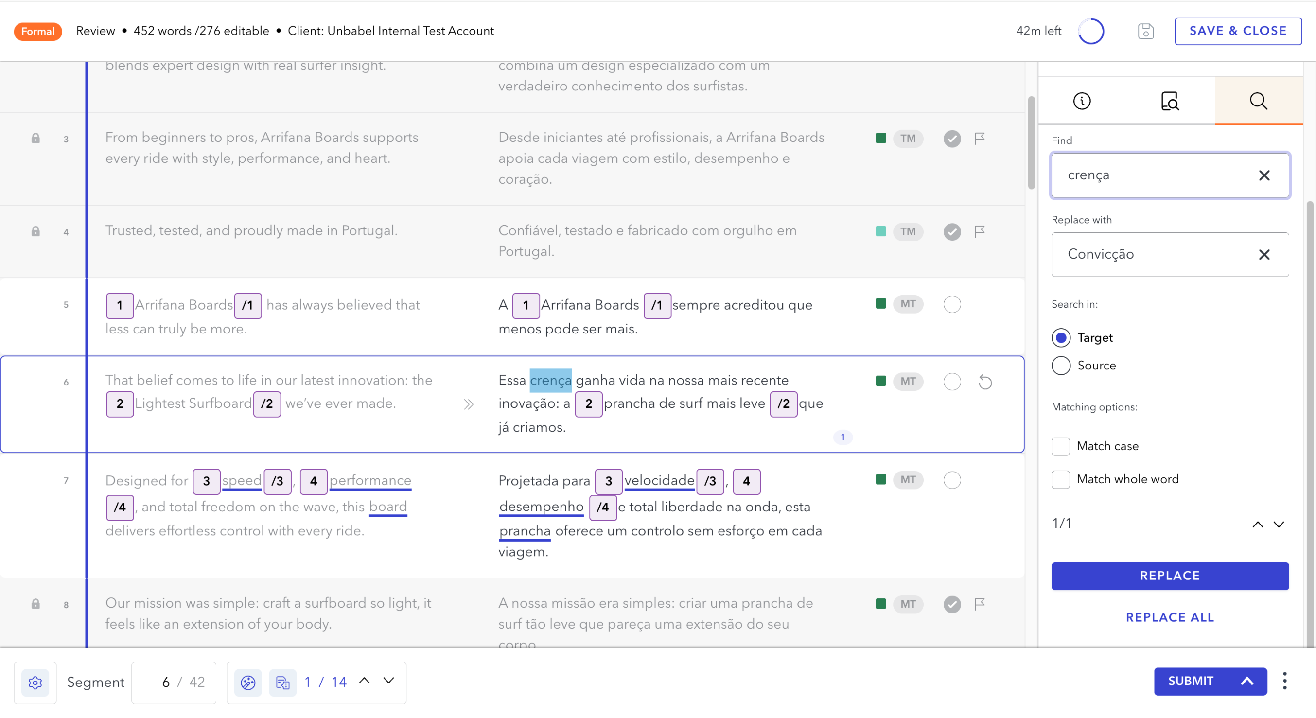 - You can replace terms individually or in bulk throughout the entire document by clicking the "Replace All" button. To learn more about restrictions on replacements, refer to the section on non-editable content below.