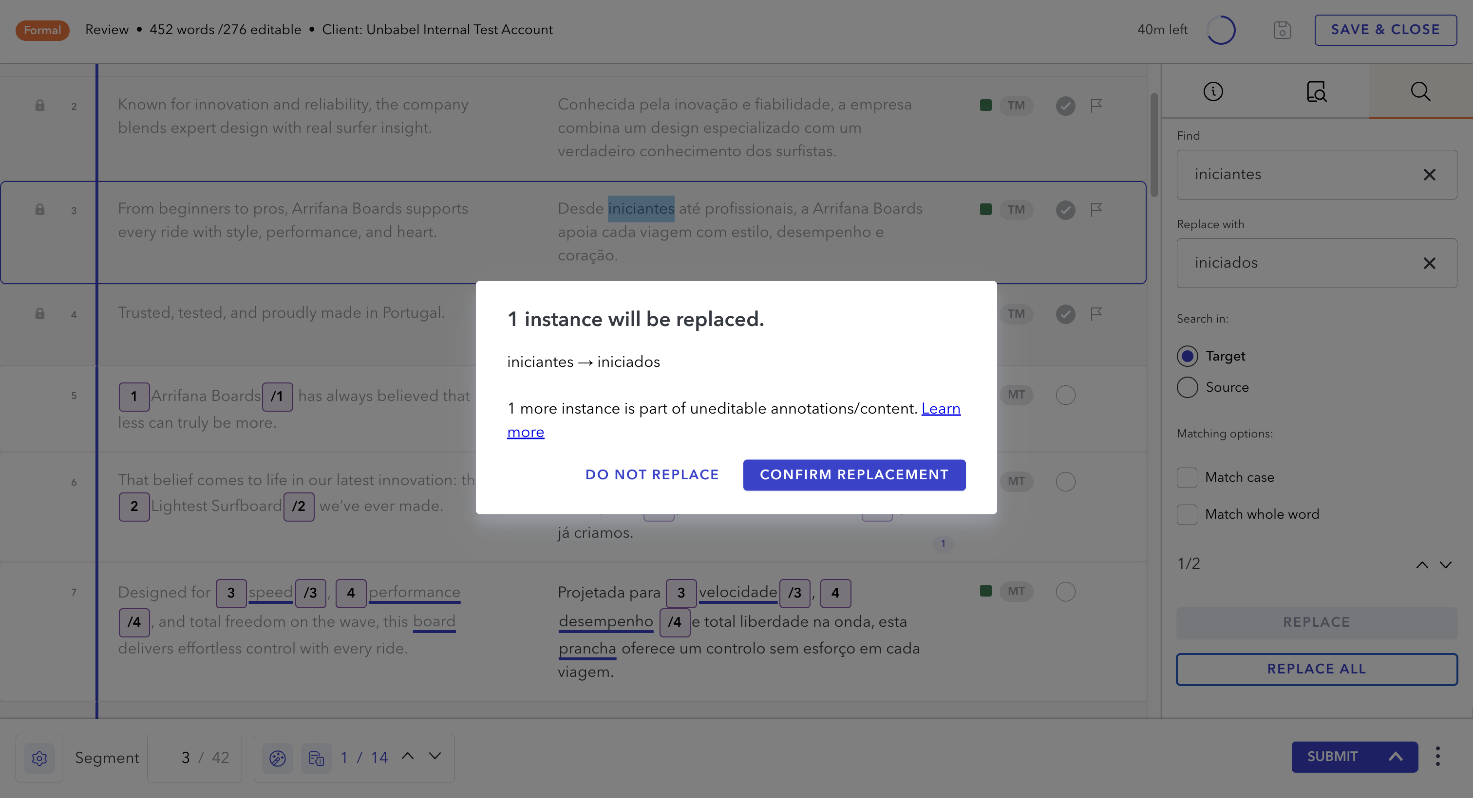 - If some of the searched instances are part of uneditable content, a corresponding message will appear in the confirmation popup when performing the bulk replacement.